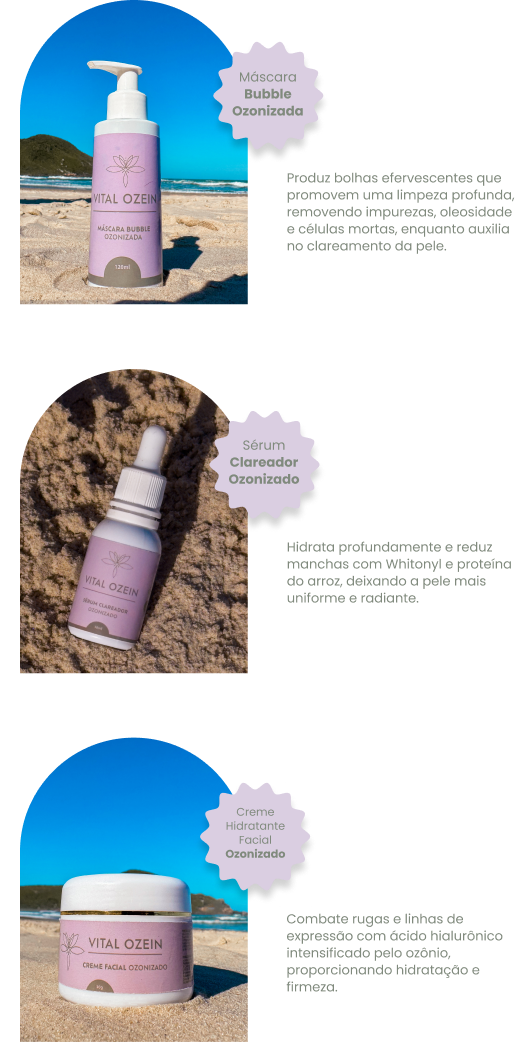 O sérum do vital Ozein contém além dos benefícios do ozônio a proteína do arroz e o whitonyl (clareador) juntos hidratam profundamente e auxiliam no clareamento da pele.
